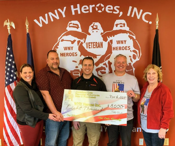 Yesterday (Nov 6, 2018), we donated a check for $8,000, raised from our 10th and final Memorial Motorcycle ride in memory of Jonathon, to WNY Heroes. It is an honor to represent all of you who have supported our benefit throughout the years and to know that in addition to the yearly $1,000 scholar-ship given in Jon’s name, the money is doing great things for our veterans through this organization. What a blessing to have WNY Heroes available in our community to support veterans and their families. We know they will put the money to good use.