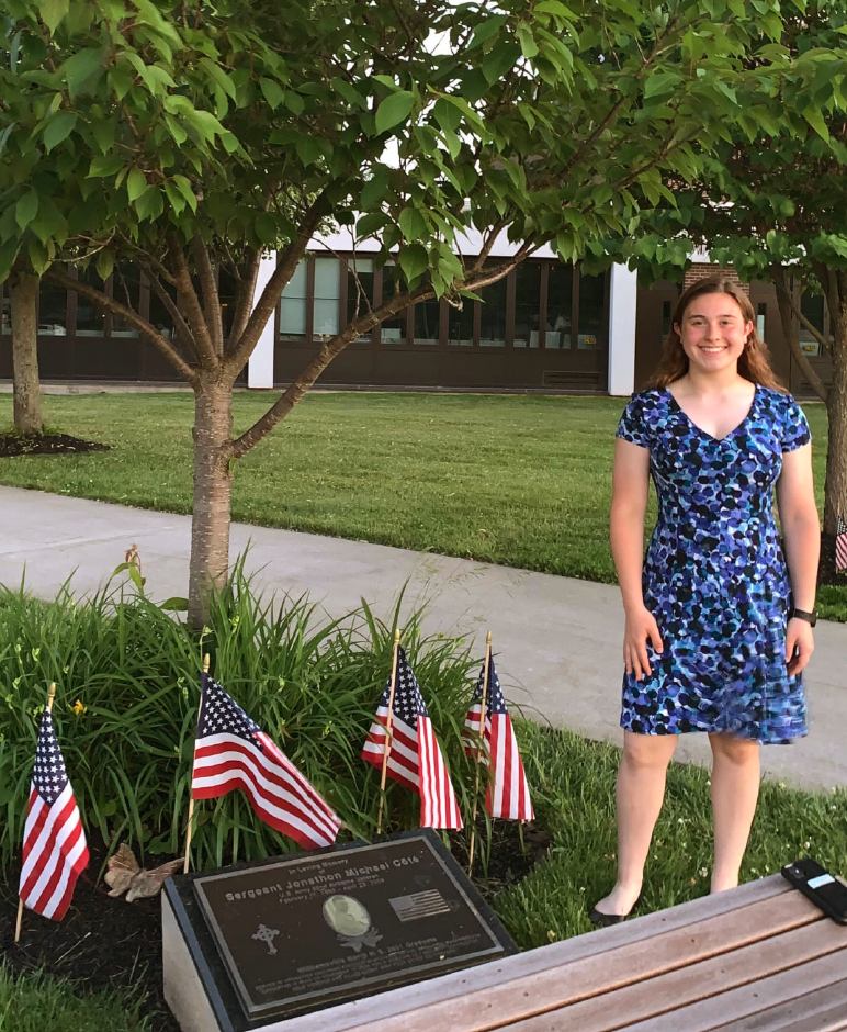 Julianna standing in front of Jon’s tree and memorial in front of Williamsville North HighSchool, Williamsville, NY.